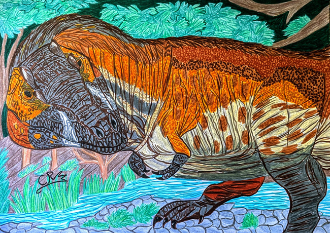 Caldey has depicted the theropod next to a small stream with a woodland in the background. The dinosaur has its head turned to face the viewer. Caldey chose to use artist pens to create her drawing. It is a vibrant illustration. Her eye for detail has enabled the young artist to depict the sophisticated colouration of the tyrannosaur model.