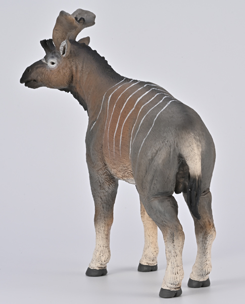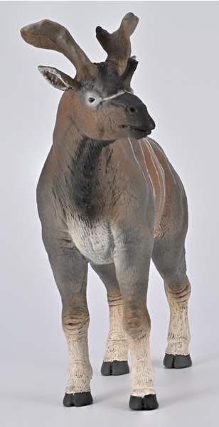 Model collectors have requested a Sivatherium figure and CollectA have delivered. Fossils of S. giganteum come from the Siwalik Hills of India. It was formally named and described in 1836 (Falconer and Cautley). The CollectA figure depicts a robust and powerful animal, with a thick neck. The head is large and the muzzle tapers to a mouth with large, probably prehensile lips. These lips helped this enormous browser cope with tough thorns on the branches that it fed upon. There is a scar on the left forelimb close to the scapula. This wound could have been caused by a predator or perhaps by the ossicones of a rival male during intraspecific combat.
