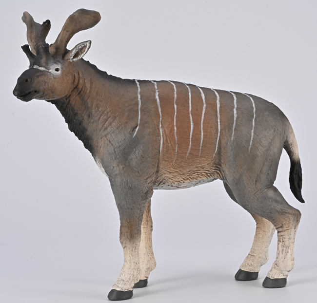 Males possessed two pairs of ossicones. The first pair were located just above the eyes and were quite small. The second pair, located towards the back of the skull were much larger and palmate. It is likely that the tips of these structures became bald as the animal matured (a characteristic observed in living giraffes). The design team have given their prehistoric giraffe a very different colour scheme compared to a modern giraffe. There is no reticulated pattern. Instead, the CollectA Sivatherium model has been given a mainly grey coat with splashes of brown.