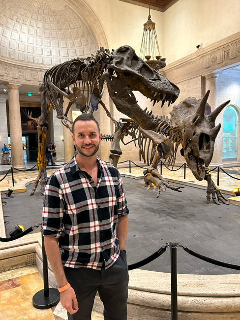 Palaeontologist Dr Dean Lomax in front of two iconic dinosaur exhibits. Picture credit: Dr Dean Lomax.
