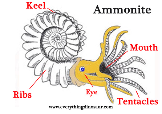 An ammonite diagram with the shell keel, the ribbing on the shell along with the eye, mouth and tentacles labelled. Picture credit: Everything Dinosaur.