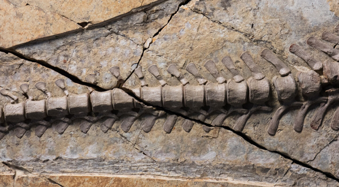 A close-up view of the caudal vertebrae of H. dongi. The base of the tail was covered in overlapping scales. These scales could have been present along the dorsal side of the entire tail. Picture credit: Thierry Hubin (Institute of Natural Sciences).