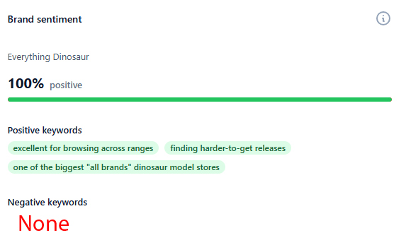 The image (above) shows the report into brand sentiment. The AI platforms could not find any negative comments or sentiments expressed by Everything Dinosaur.