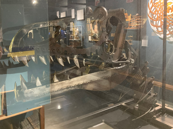 Dinosaurs turn up in all sorts of places. For example, we discovered this amazing mechanical dinosaur head on a visit to the MAD (Mechanical Art & Design) Museum in Stratford-upon-Avon. The contraption is based on the skull of a Tyrannosaurus rex. The jaws open and this dinosaur roars. It is a clever piece of mechanical engineering.