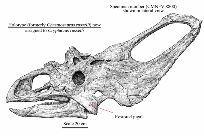 A reassessment of horned dinosaur fossils discovered ninety years ago in the famous Dinosaur Provincial Park Formation of Alberta has led to the erection of a new chasmosaurine species. Previously assigned as the holotype for the species Chasmosaurus russelli, the fossil material (CMNFV 8800), has been re-described as Cryptarcus russelli. This revision of chasmosaurine fossil material demonstrates how modern research continues to refine dinosaur classification.