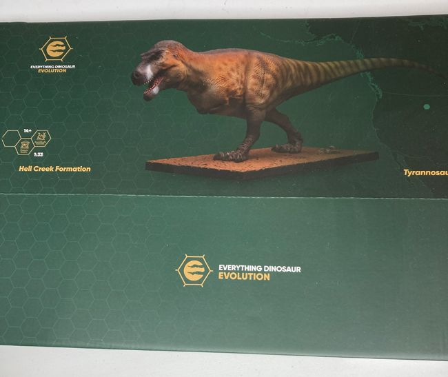 Celebrating a British T. rex on St George’s Day. The packaging for the Everything Dinosaur Evolution 1:33 scale T. rex model – “there be dragons”. Picture credit: Everything Dinosaur.