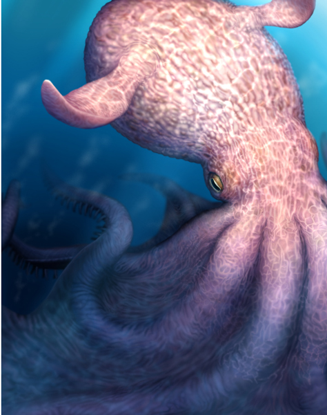A life reconstruction of the Cretaceous giant octopus. Picture credit: Yohei Utsuki, Department of Earth and Planetary Sciences, Hokkaido University.