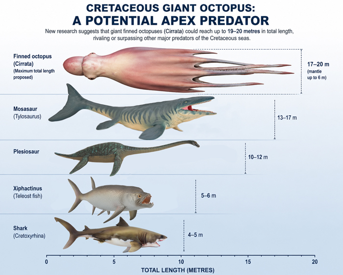 “Our findings suggest that the earliest octopuses were gigantic predators that occupied the top of the marine food chain in the Cretaceous. Based on exceptionally well-preserved fossil jaws, we show that these animals reached total lengths of up to nearly twenty metres, which may have surpassed the size of large marine reptiles of the same age.”