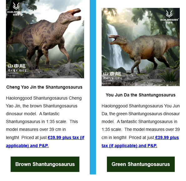 Each pair of figures is modelled in 1:35 scale. The Shantungosaurus pair measure an impressive thirty-nine centimetres in length.